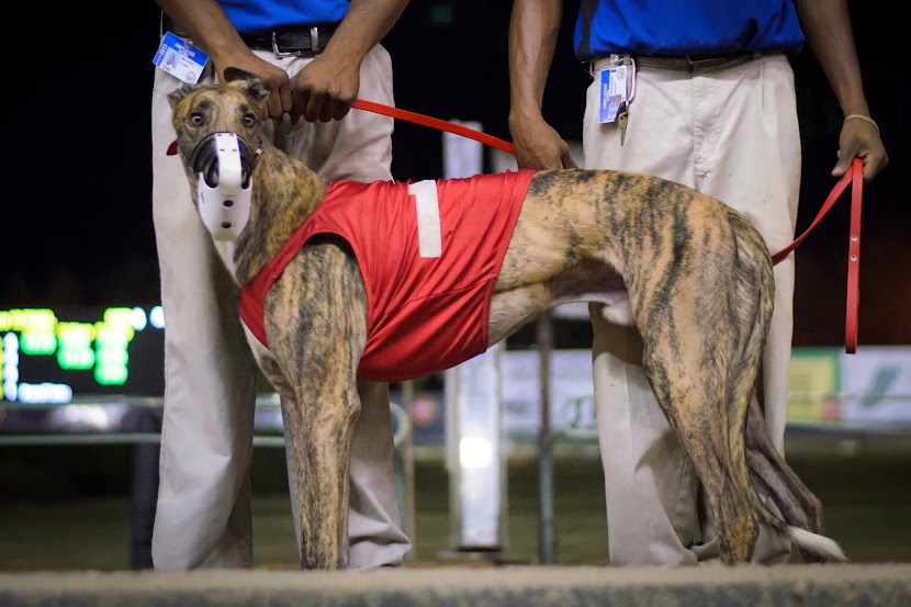 Soon it is time to get ready for the day’s race. The greyhounds racing that day are taken to the paddock where they get a tag with their race number and starting box number on it. They are then ready for the pre-race examination by the track veterinarian, track judge and other officials. Urine samples are collected for drug testing, dogs are weighed to ensure they are in their target weight range, and they are checked for proper condition. If they appear injured or sick, or aren’t within their target weight range, they are scratched from the day’s race.
